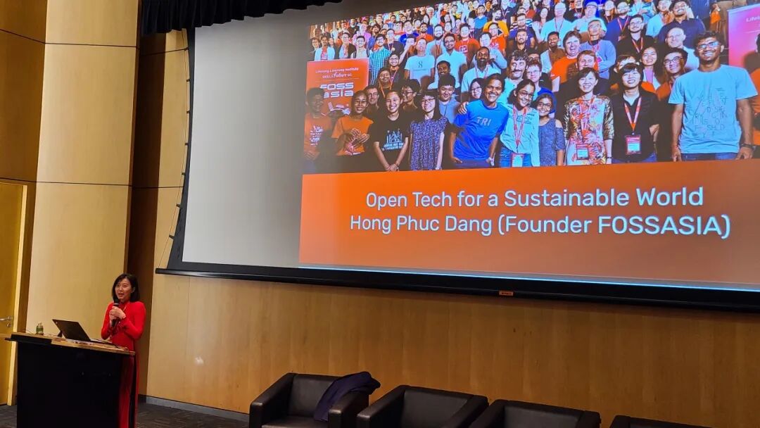 2009 年起,Hong Phuc Dang(下图演讲的红衣美女,越籍华裔能说中文的前 OSI 副总裁,FOSSASIA 发起人)连续 14 年举办 FOSSASIA Summit,而且越办越成功。作者在此强烈推荐所有国内读者的关注与参与。