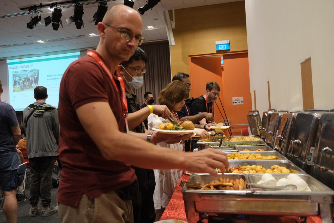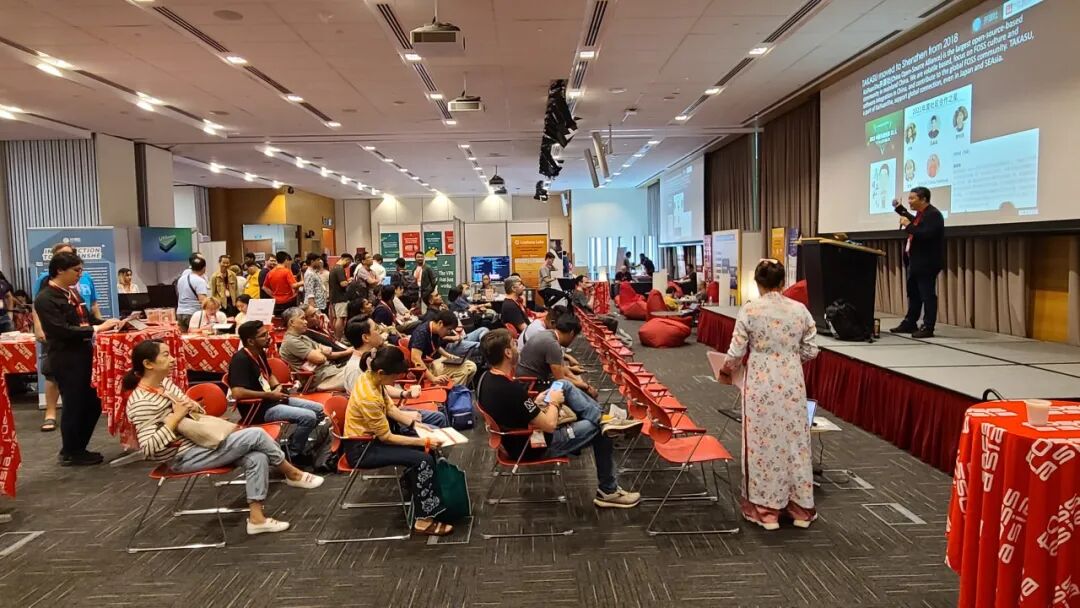 我们是大约九点钟到的会场,先是到签到处领取各自的名牌,然后就去了主会场 Lecture Theater,会场基本坐满了人,估计有200来人吧,先是会议组织者 Mario 先生致开幕词,然后是会议组织者 Hong Phuc 女士致欢迎词,接下来就是 keynotes 演讲,里面就有我们中国的小伙伴,来自 openEuler 社区的王建民同学,能在如此重大的会议上做 keynotes 的一定是很优秀的。会议中间休息时,我们又赶去了开源社的展台为其他参会人员分发纪念品、T恤衫、宣传资料,介绍开源社。我们的展台左边是韩国 Ubuntu 社区,右边是德国 OpenTec 展台,上午有不少人员来我们展台了解开源社和旗下的相关项目,我们的纪念品、T恤衫这些很受欢迎。中午就在 Event Hall 展厅吃 buffet 自助餐,展厅比较大,在两侧靠墙位置分别布置了两排餐桌,有新加坡当地美食,也有其他东南亚风味的食品,来自各个国家的参会者经过一个上午的活动也都饿了,大家井然有序地排队取餐盘,打菜,取饮料,边吃边听开源社正式成员 TAKASU SAN 的演讲,气氛特别热闹和融洽。下午我们各自去听自己选择的 topic, 中间休息的时候也有再次回到展台处理相关事务性工作。我们几个团员的演讲都在第 2 和第 3 天,可能因为开源社这次是后提交演讲 Topic 的原因吧。晚上散会后,有幸与 Ted 老师共进晚餐,就在酒店对面的一个小店,品尝了最地道的新加坡小吃,姜撞奶。晚上各自回酒店休息并完善修改演讲资料。