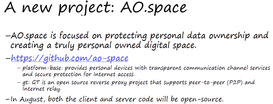 With the increasingly severe security of personal data and privacy, Jianmin and his colleagues initiated and established the AO.space project,with the support of the Chinese Academy of Sciences Software Institute.随着个人数据和隐私安全日益严峻,在中科院软件所支持下,建民和同事一起发起并成立了傲空间项目。AO.space project is a scientific research with safeguarding personal data ownership, security and privacy as the core. The team will release more open source solutions in August. Welcome everyone to follow and participate in the Aospace community.该项目是一个以保护个人数据所有权、安全和隐私为核心的科研项目,团队也即将在 8 月份发布更多项目产出的开源解决方案,欢迎大家关注和参与傲空间社区。