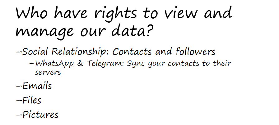 Platforms have rights to decide whether we can view or manage our data in cloud. But users don't have rights to decide whether platforms can view or manage our data. The ownership belongs to platforms.