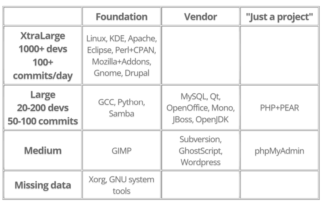 大型项目20-200 开发者50-100 提交次数/天 | GCC, Python, Samba | MySQL, Qt, OpenOffice, Mono, JBoss | PHP+PEAR |