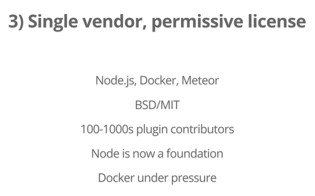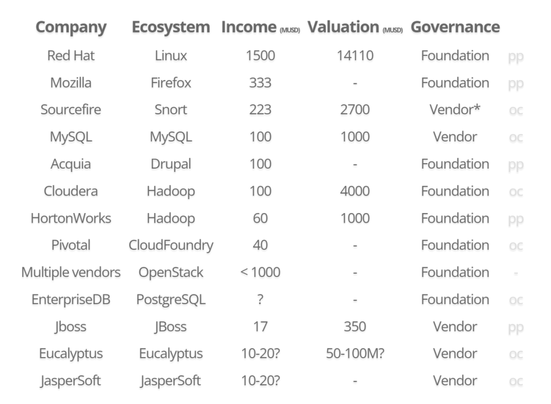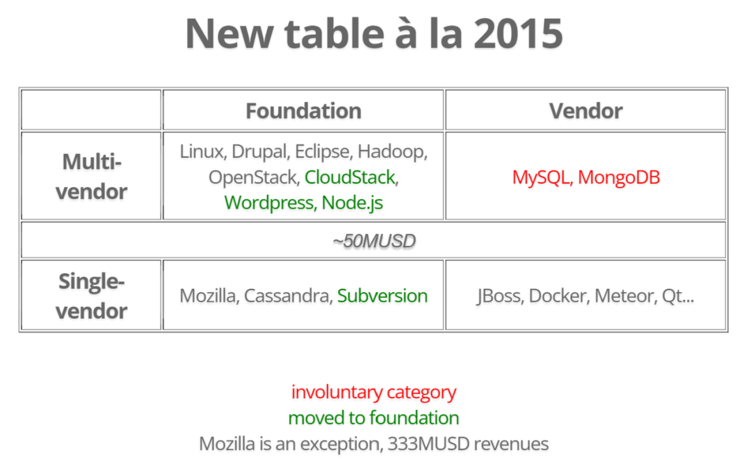 单一厂商 | Mozilla, Cassandra, Subversion | JBoss, Docker, Meteor, Qt... |
